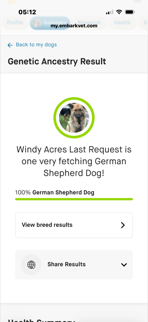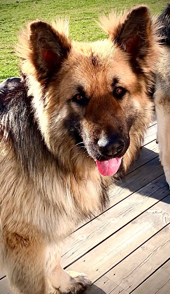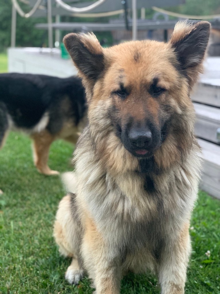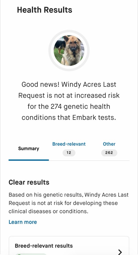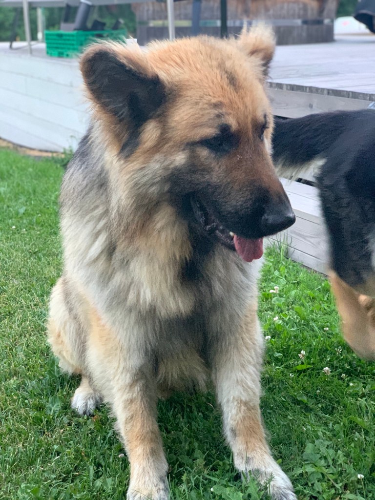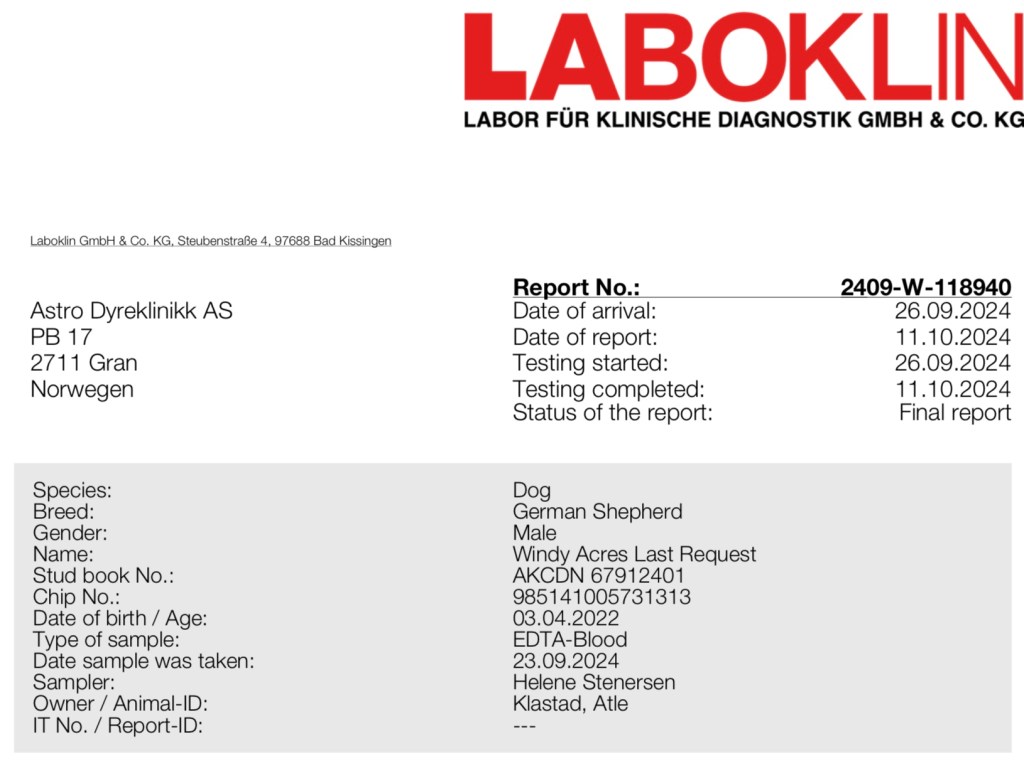 DNA testet for: Breed determination (Rase – Schæferhund), Degenerative Myelopathy (DM), Hyperuricosuria, Hårlags-variant (Langhår), MDR1, Pituitary Dwarfism. Boone har ikke påvist gener for de mest vanlige genetiske arvelige sykdommer for rasen.