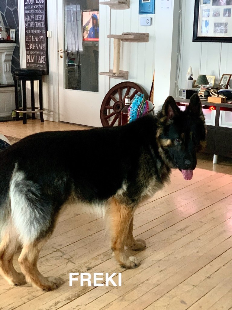 Freki er høy og mørk, en ordentlig kjekkas. Men ikke la deg lure. Bak dette mystiske ytre finner du en myk og morsom hannhund som vil sjarmere deg i senk. Han er som Ferdinand: glad i blomsterengen og opptatt av fluer. Freki er en rolig type, men han varsler og gjør seg til kjenne om han mener det er fare på ferde. Freki er kullbror til Geri.