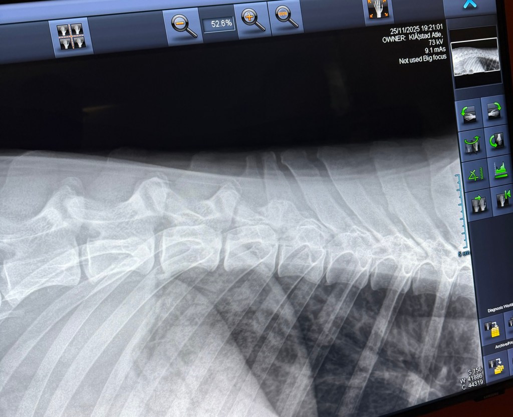 Freki har også vært på røntgen nå i november 2025, i en alder av 3år og 8måneder. Dette grunnet et ønske om å avdekke eventuelle svakheter eller forandringer i skjelett. Freki er en kraftig og stor hund med mye muskler og kraft, så her er det store påkjenninger. Rygg og albuer ble sjekket og resultatene var fantastiske og meget bra! Han har mikroskopiske forandringer i rygg og en flott bakpart med robust lende-rygg. Albuene er som tidligere, uten stor signifikant forandring. En frisk og sunn 4 åring! Freki har et utrolig flott vesen og er en ordentlig glad Bamse-gutt med masse kjærlighet til alle.