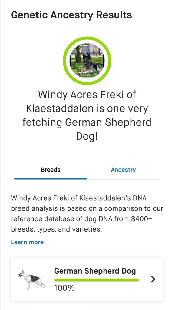 DNA testet november 2025. Har ingen anlegg eller risiko for 12 rase spesifikke sykdommer og hans DNA er 100% Tysk Schæferhund. Flotte og fantastiske helse-resultater.