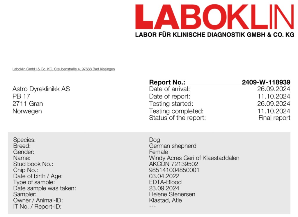 DNA testet for: Breed determination (Rase – Schæferhund), Degenerative Myelopathy (DM), Hyperuricosuria, Hårlags-variant (Langhår), MDR1, Pituitary Dwarfism. Geri har ikke påvist gener for de mest vanlige genetiske arvelige sykdommer for rasen.