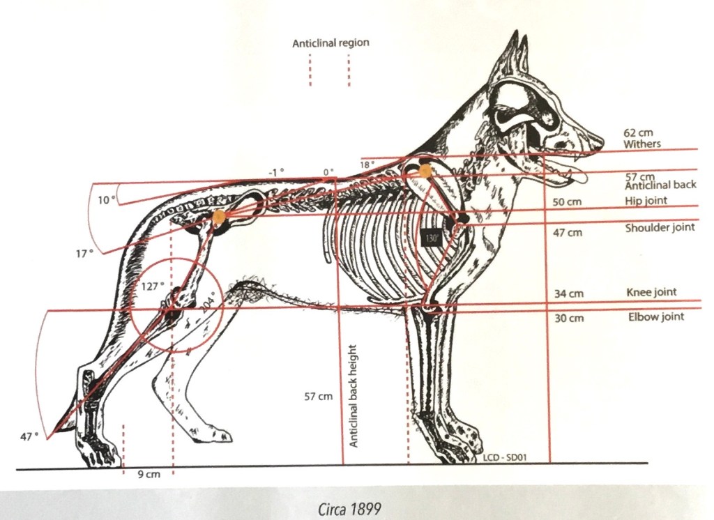 Hvis vi ser tilbake til ca. år 1899, så hadde gjennomsnittshunden i rasen en mankehøyde på omtrent 62 cm. Kroppen var generelt velbygd, men tendensen var at hundene kunne bli litt «tunge» bak. Bakparten var litt overbygget – altså høyere enn skulderen – og det gjorde at de fikk en høy hoftestilling og svak bakbensvinkel. Likevel var de godt balansert og sto stødig med et imponerende uttrykk. Forlemmene og baklemmene var balanserte og godt tilpasset. De fremre og bakre vinklene var også godt balanserte, mens hundene i helhet hadde en usedvanlig rett rygg, god stand og tråkk. Hundenes bevegelser under trav og galopp var faste og tette.