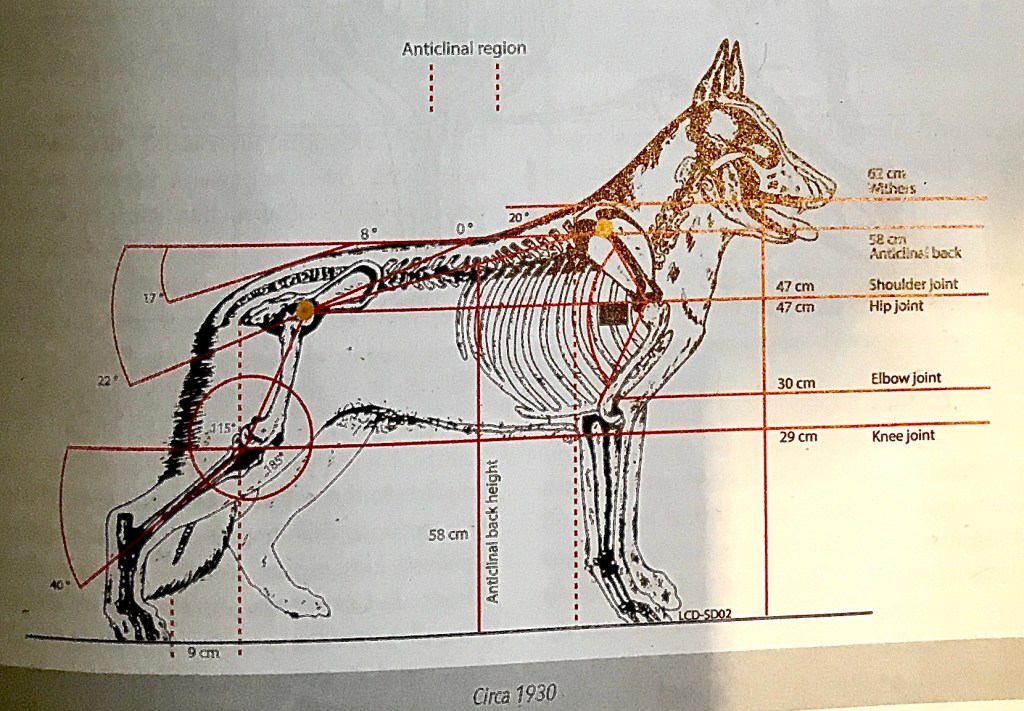 Høyden stabiliserte seg rundt 62 cm på grunn av kaptein von Stephanitz’ avgjørende påvirkning. Hundene hadde fortsatt et kort, men bedre kryss og bekkenvinkel, og rygglinjen gikk fra omtrent 20° til 22°. Bekkenvinkelen og lenden på ryggen viste svært liten helling. Skulderbladene var plassert mer fremover, og dette ga et forbedret forhold mellom hofte og skulder. Bakpartsvinkelen ved leddet mellom lår og legg viste 185°, noe som ga en mye bedre horisontal linje. Bakbena ble litt lenger. I slutten av 1930-årene begynte halene å nå bakken, men med lavere hoftestilling. Kryssene ble litt brattere. Underbrystene ble sterkere i denne perioden, spesielt ved det antiklinale området, men fortsatt ikke ideelt.