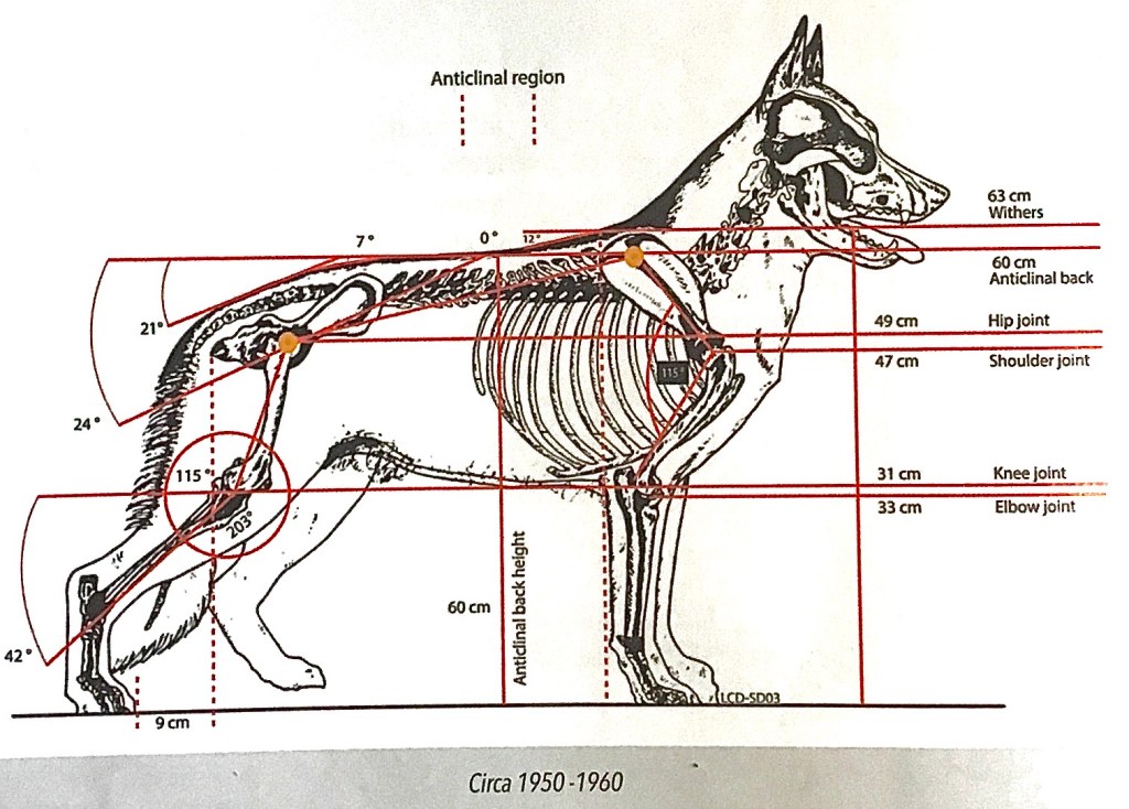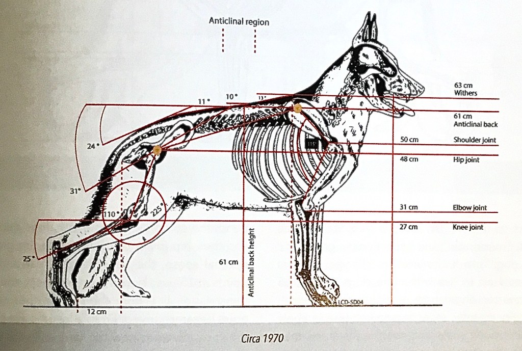 På midten av 1970-årene nådde rasen det Captain von Stephanitz hadde sett for seg som den ideelle formen, og størrelsen stabiliserte seg på rundt 63 cm. Vi så en videre stigende linje fra antiklinalregionen til krysset for første gang. Denne videre hevingen i antiklinalregionen løftet ryggen i en relativt rett linje fra nakken til krysset, svært svakt. Ribbenes bakre del i antiklinalregionen roterte svakt bakover; med andre ord, hevet den bakre delen av brystkassen litt bakover og oppover.