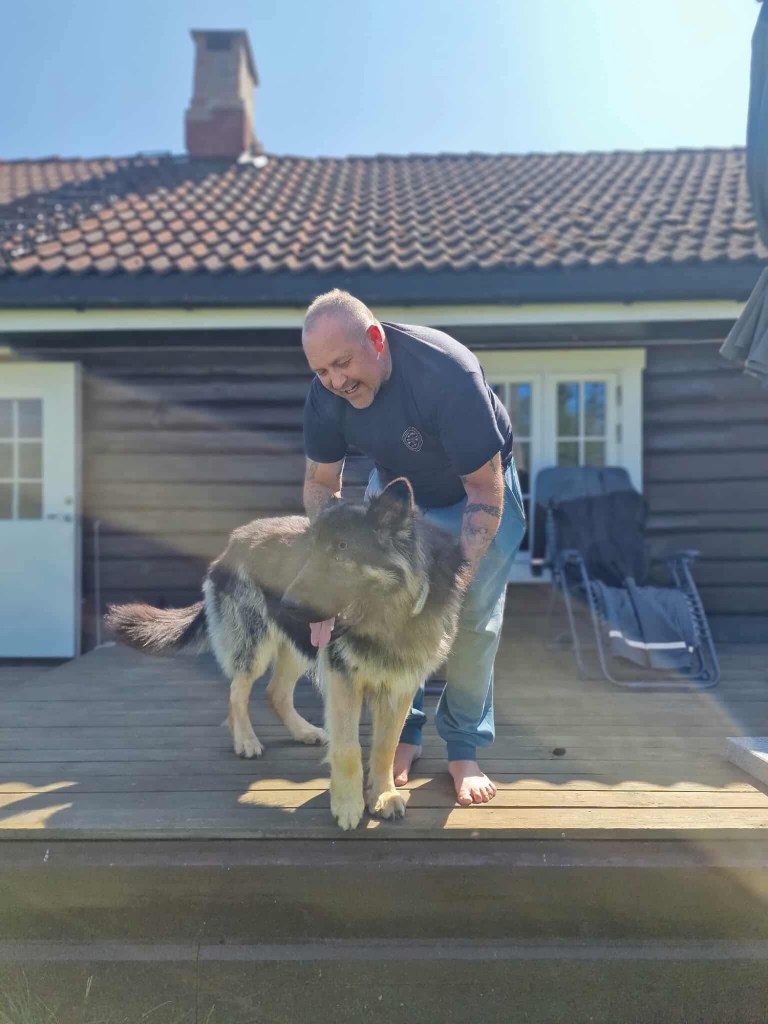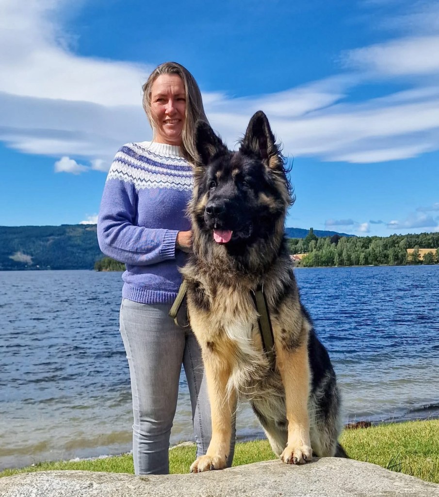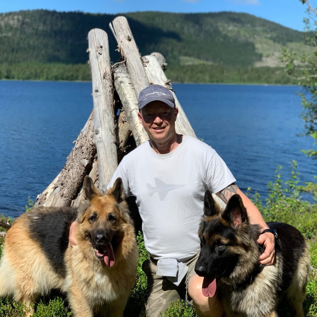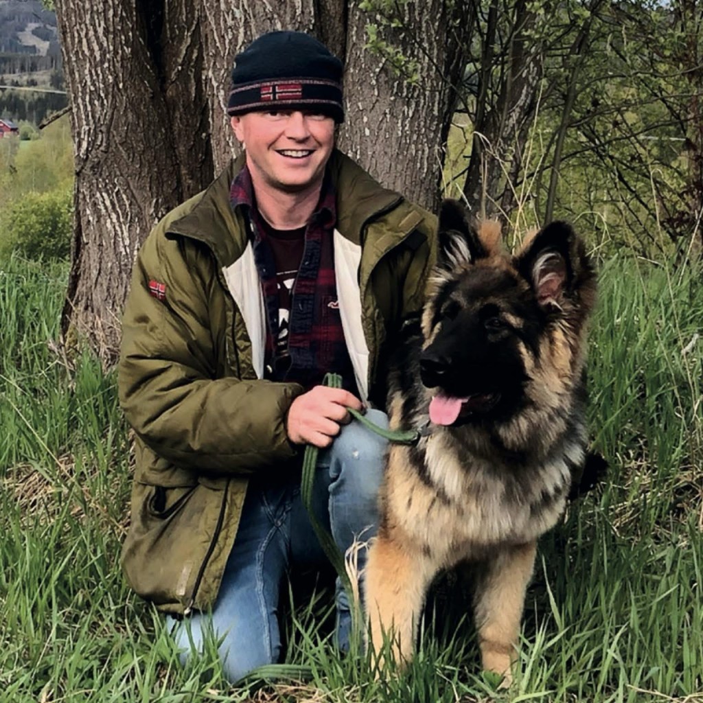 Noen naboer lengere borte ved fjorden var politi, og hadde tjenestehund, schæfer, Langhår og vanlig. Jeg var så fascinert av disse hundene, og det var nok der det startet. Vi fikk senere en schæfer i hus i familien, «Sandy», hun var en helt herlig tispe som lærte meg mye i en alder av 12 år. Senere i militæret var jeg så heldig å tjenestegjøre i Libanon, i 1991 KP A (4-25CP/ lagsleir). Vi gikk stadig på patrulje natters-tid med Forsvarets hunder, littegrann skarpere en Sandy hjemme kan du si😄. Etter at jeg tjenestegjorde som instruktør på Jagerfly både hjemme og i USA, endte vi med å ta med en Schæfer valp hjem fra USA, Iowa. Jeg leitet lenge etter en oppdretter som hadde hunder slik jeg husket Schæferhunden fra 1970 tallet, før den ble modernisert. Jeg kaller schæferen vi har i dag for «moderne», siden den er litt annerledes enn fra mine eldre tider, i alle fall eksteriørmessig. Den har forandret seg, sikkert både på godt og vondt. Men jeg fant i alle fall et eksemplar der oppdretter hadde fokusert mere på de gamle linjene, med rettere topplinje (rygg), litt grovere og kraftigere bygning og disse var med et mere familievennlig lynne. I den forstand at Schæferhunden også kunne passe bedre for den vanlige familien, som ikke nødvendigvis hadde forutsetninger for å ta vare på en høy-aktiv politi/ militær schæfer på «redbull».