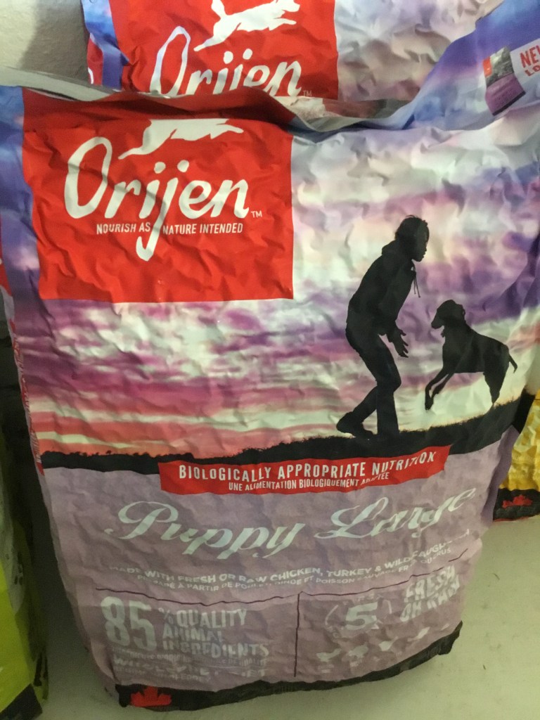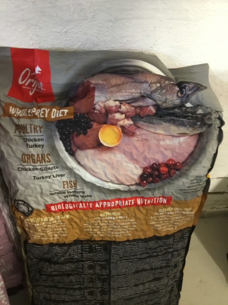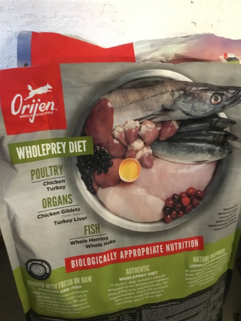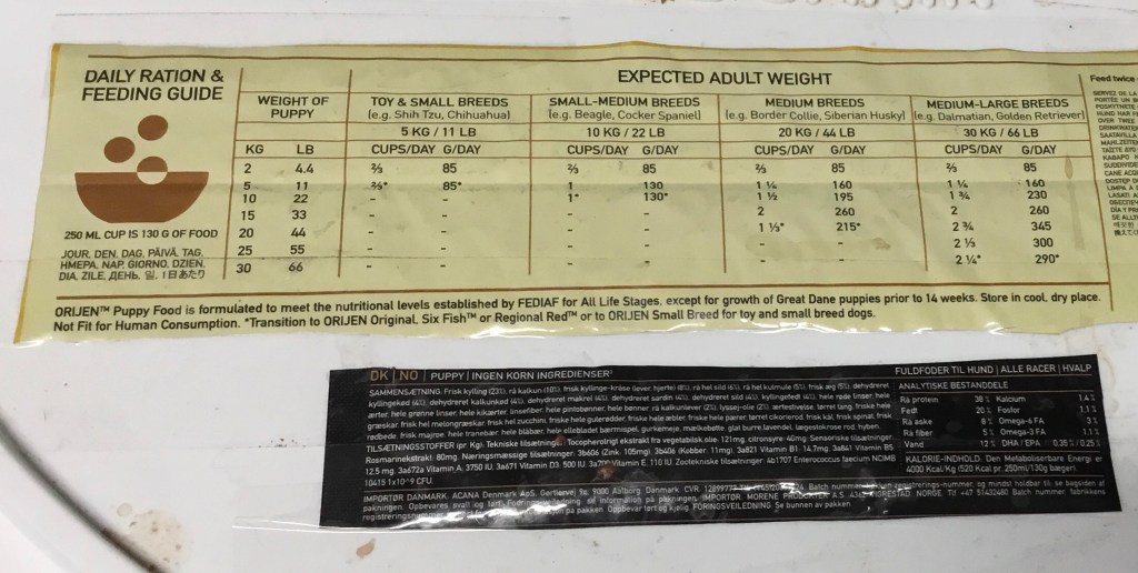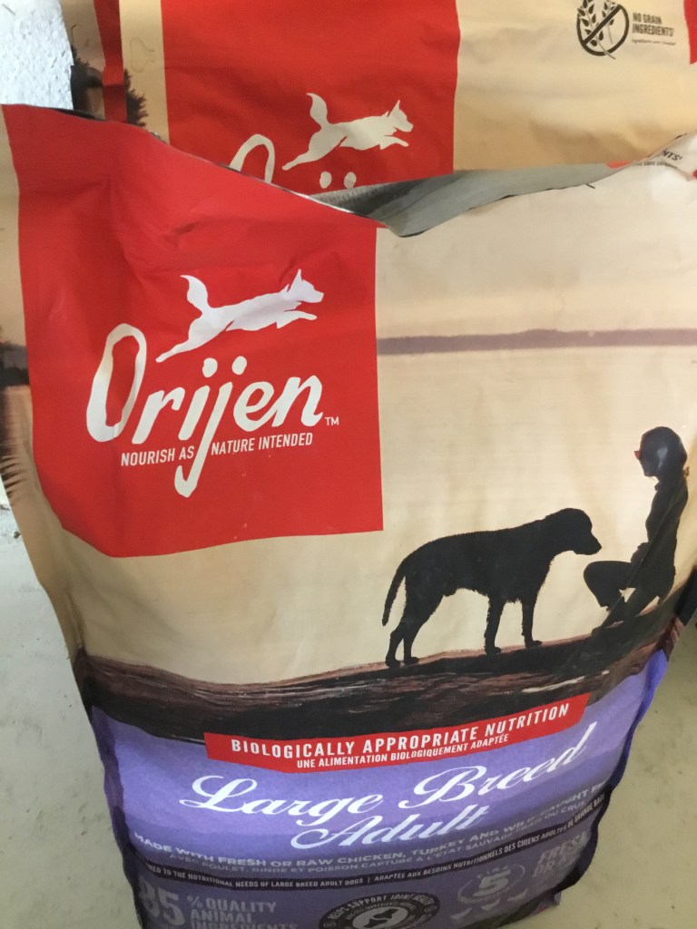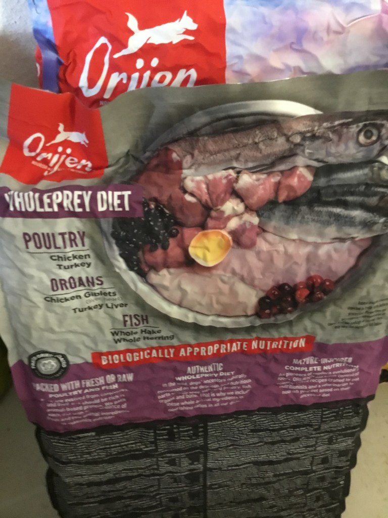 Tørrfôret nedenfor er fra Orijen, kvalitetsfor uten korntilsetning. Dyr, men utrolig næringsrik, slik at man må nesten se hvordan hunden responderer med vekt i forhold til aktivitets- nivå og mengde fôr, totalt sett. Hunden er fasit, så justerer man etterhvert.