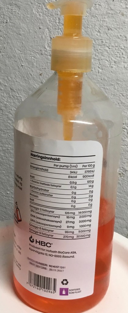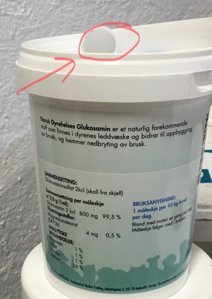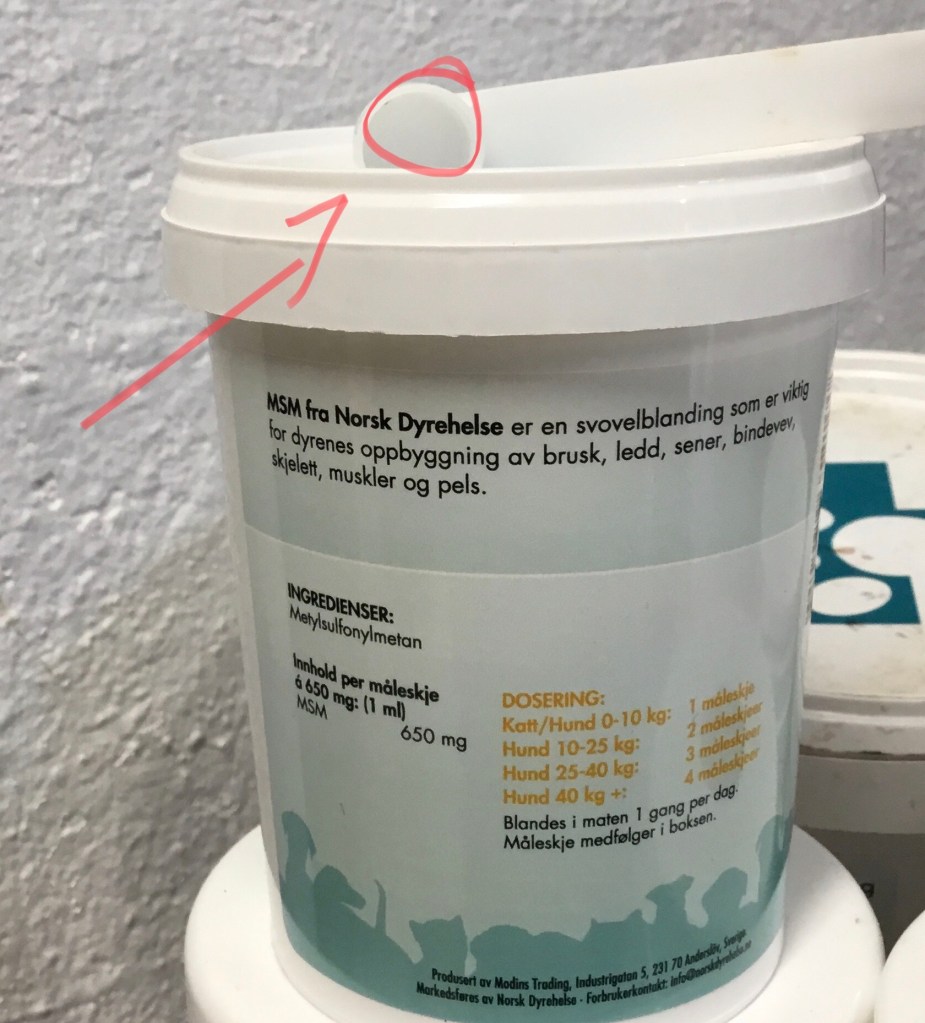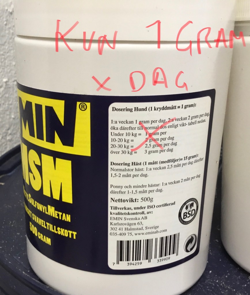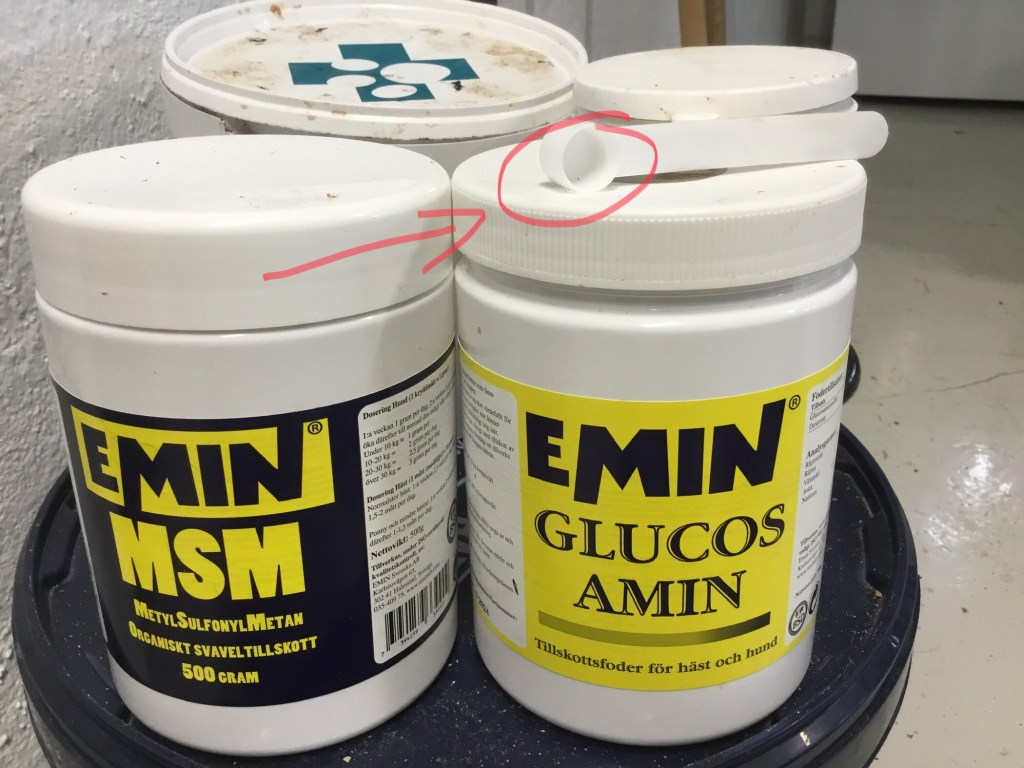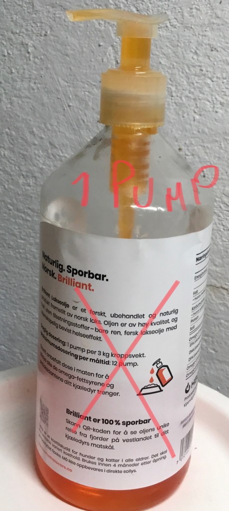 Glukosamin og MSM er sunne tilskudd som restituerer og forebygger skader for ledd, bein og scener. Klikk på bildene for ytterligere informasjon. Vi gir dette daglig. Jeg følger instruksjonene fra Norsk dyrehelse sine bokser ordrett i forhold til dosering, de har også måleskjeen jeg bruker for felleskjøpets litt større bokser. For Felleskjøpets beholdere bruker jeg altså kun en måleskje fra hver boks (glukosamin og msm) en gang om dagen (kun 1 gram pr. Dag for voksen hund). Det er litt under beskrevet dose, men det er greit. For valper og unghund kjøper jeg Norsk dyrehelse sitt produkt og følger vekt anvisningen til punkt og prikke. Lakseolje får de kun ett trykk i hvert måltid, liten som stor. Det er igjen litt mindre enn beskrevet dosering, men de får i seg omega 3 og 6 fra andre kilder gjerne i tillegg.