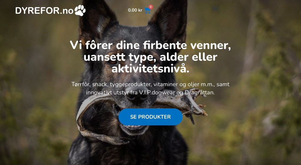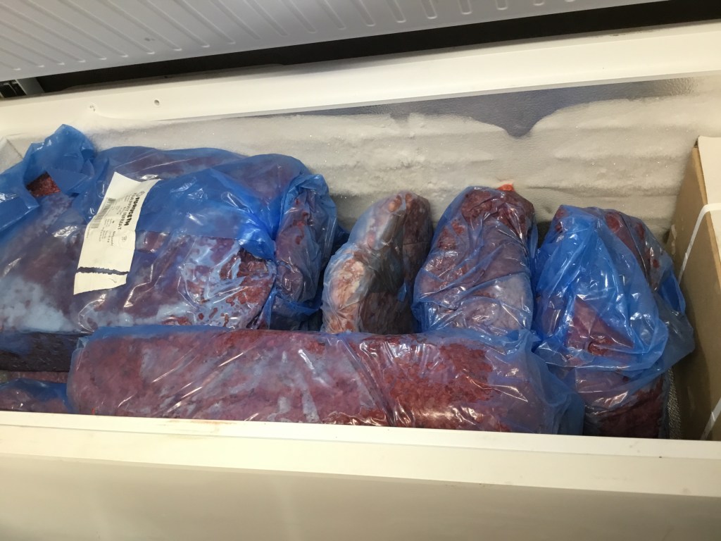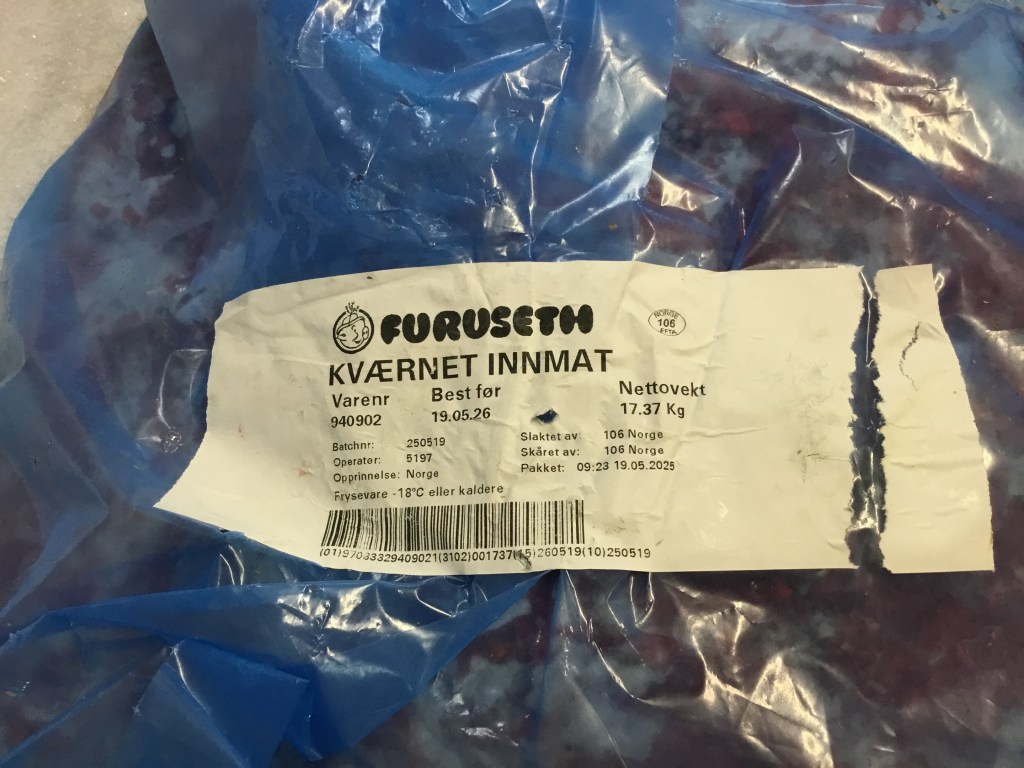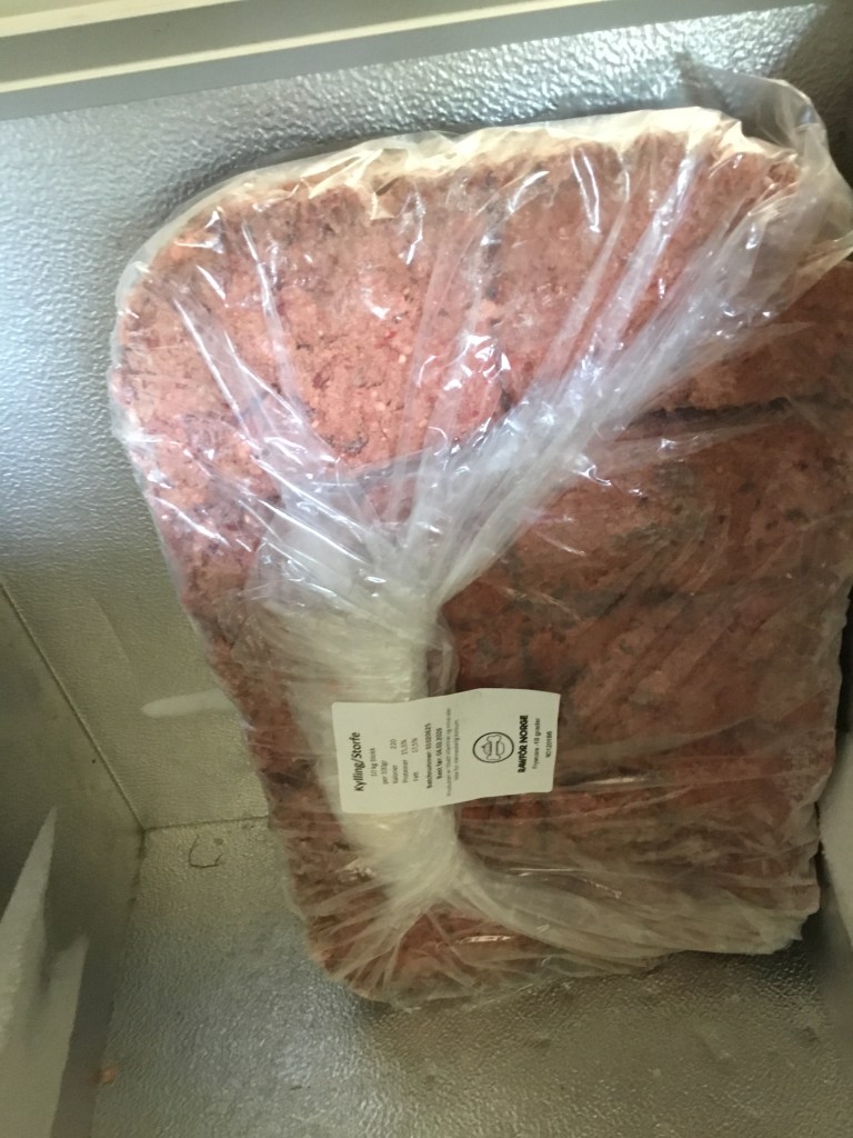 Først nedenfor ser du noen bilder fra maten vi bruker nå. Våre hunder får våtfôr, ca opp mot en halv kilo (350-450g) pr. Måltid to ganger om dagen. (På morgen mellom 7-10, og på ettermiddag mellom 19-19:30). Nå bruker vi våtfôr fra Dyrefôr.no, kommer i 18 kilos blokker. Jeg kutter med kjøttsag og fryser ned. I tillegg får de 3-4 dl tørrfôr hvert måltid blandet med litt vann og våtfôret.
