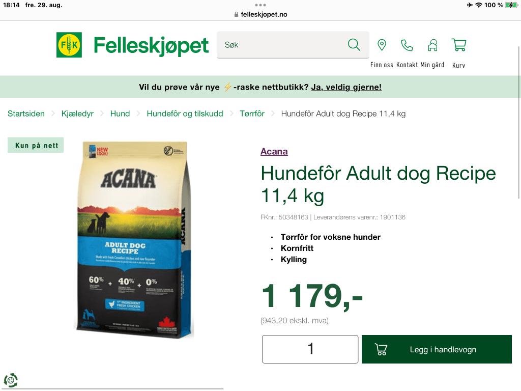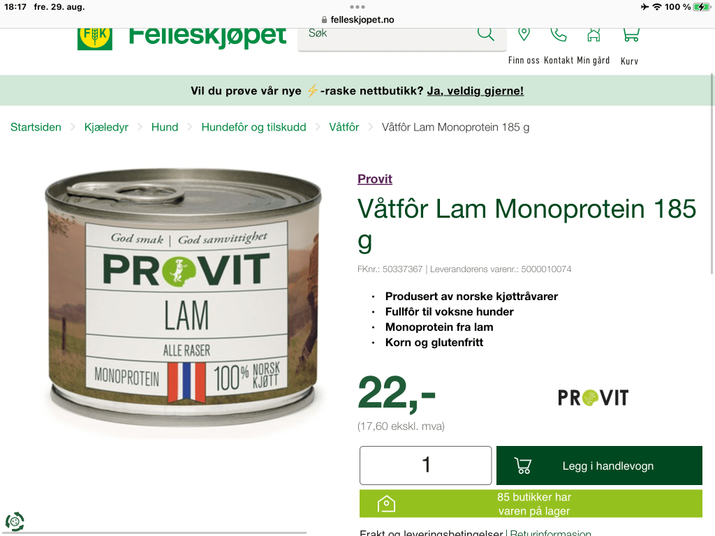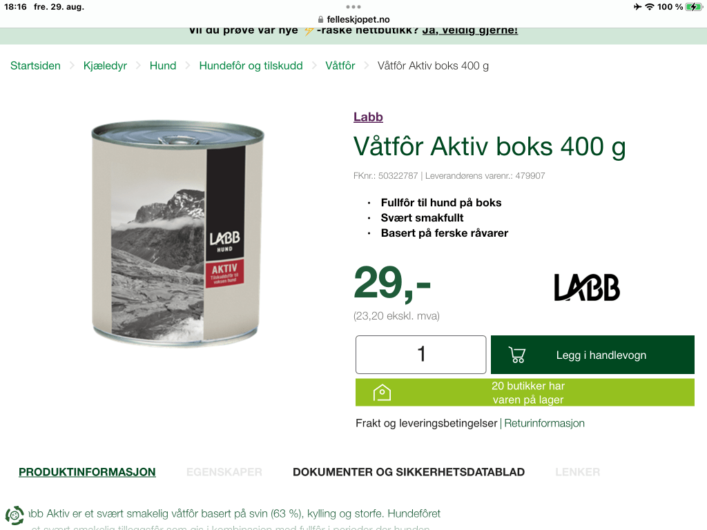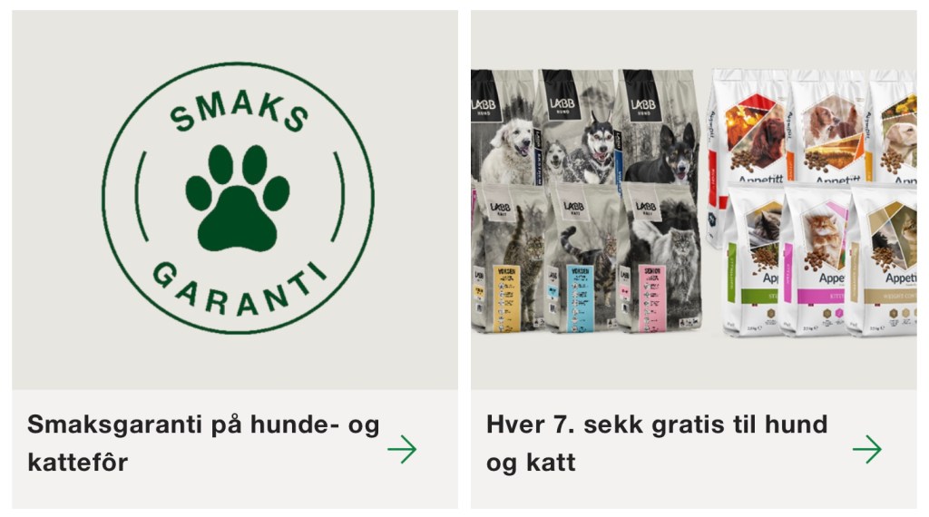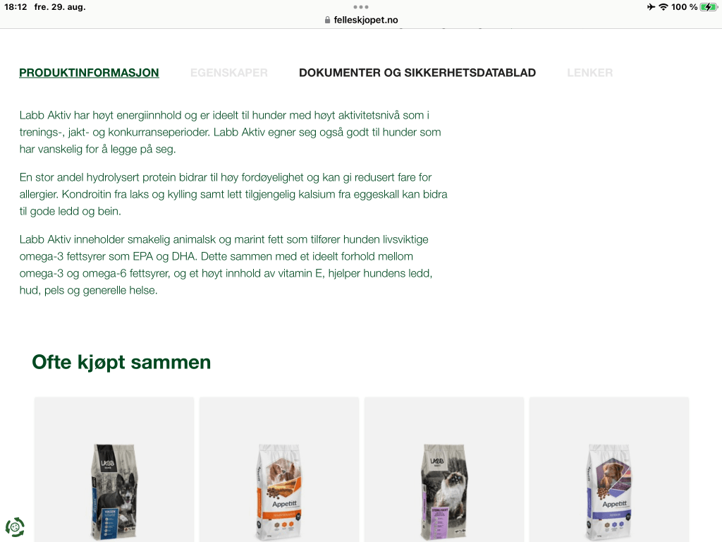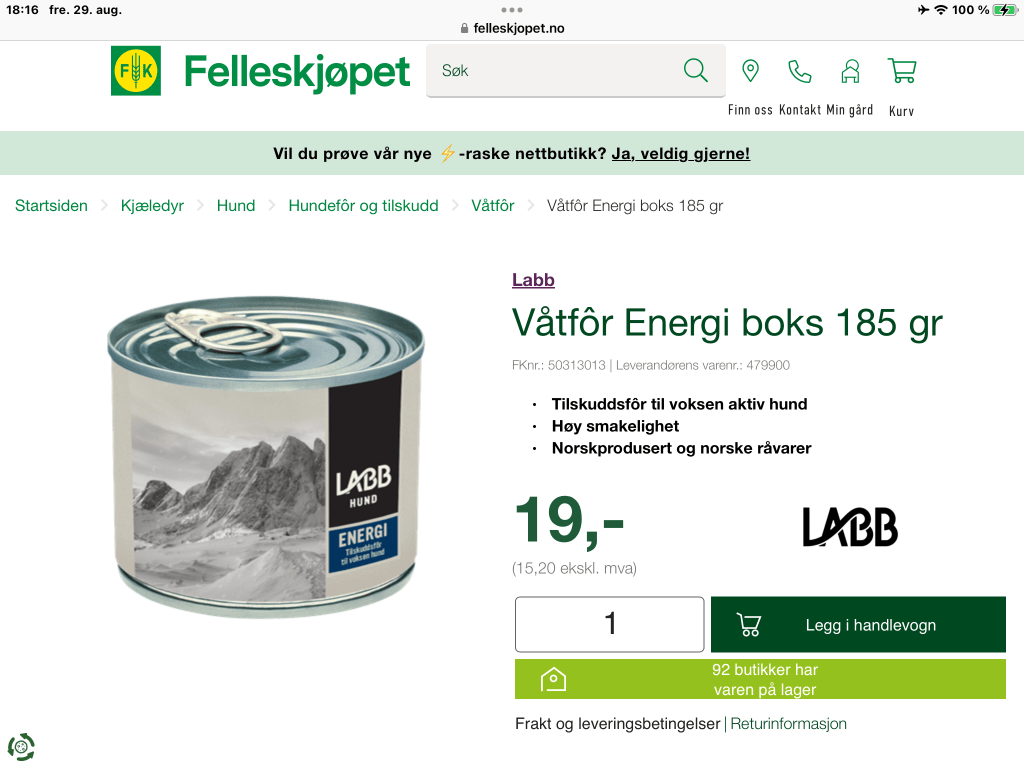 Labbserien har vi brukt mye før, den er litt rimeligere med varierte produkter for aktive og mindre aktive hunder. Husk på at det også er forskjell på mengde fôr på vinteren mot for sommeren. Hundene bruker gjerne mer energi på vinteren. Labb har også hydroliserte proteiner som skal være mer skånsom og forebyggende for allergi, og/ eller sensitive mager. På Felleskjøpet får du den 7de sekken gratis.